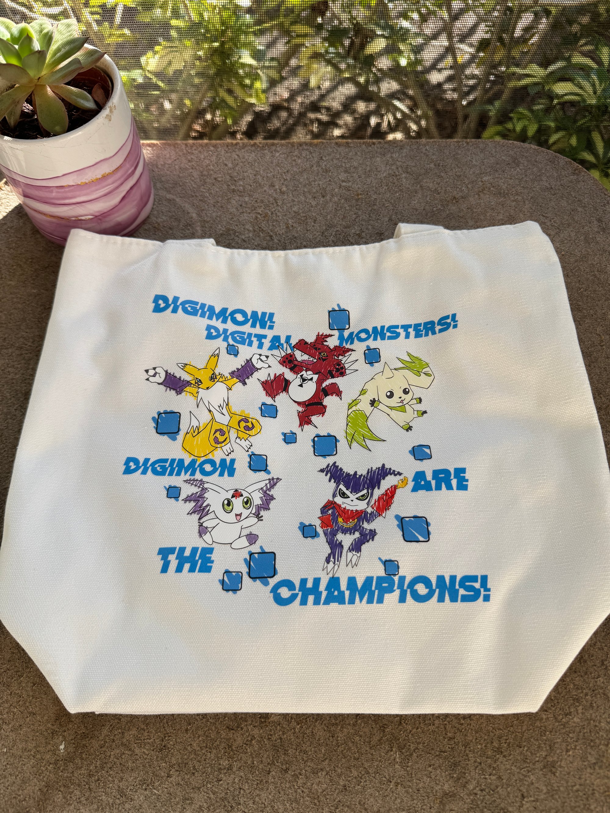 Tote bags with magnet locking clasp with inner zipper of Mao Mao from The Apothecary Diaries, Enjin from Gachiakuta and Digimon from Digimon Tamers.
