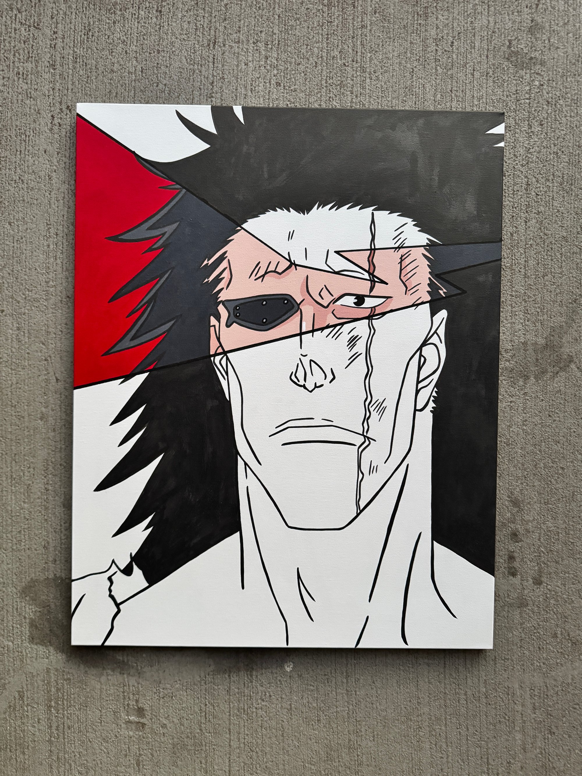 Kenpachi from Bleach TYBW Arc up close and strong willed. A blend of manga black and white with a minimalist color palette strip.