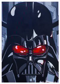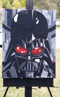 I was commissioned to do Darth Vader. The original may be sold but prints are available. It was made clear to keep the sci fi roots in the piece. Thats why the geometric greyish shapes are in the background to go with the Deathstar and also the sci fi look. I chose to do an upclose shot of the Sith Lord. I had the color red reflecting on his face for the hue of his light saber. It also helped emphasize the evil within. The colors are strongly saturated and bold, with solid line work. Hand painted with acrylic paint on a backstapled canvas.
